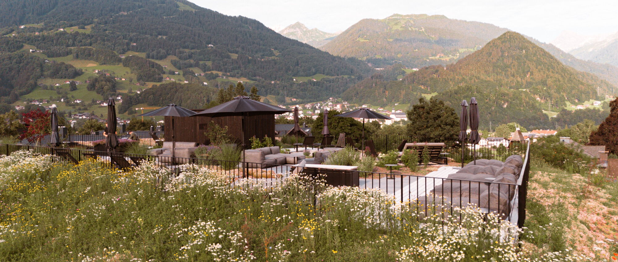 AMRAIs Maisäß-Mahd ist kein Dachgarten wie jeder andere – sondern ein Hochgenuss auf höchster Ebene. Hoch oben über Schruns, wo der Himmel zum Greifen nah ist, entfaltet sich ein Garten, der alles überragt: 360 Grad Bergpanorama, soweit das Auge reicht, vereint mit der stillen Magie von Bergwelt und Weitblick. Rundum nur Gipfel, Gipfel, Gipfel.